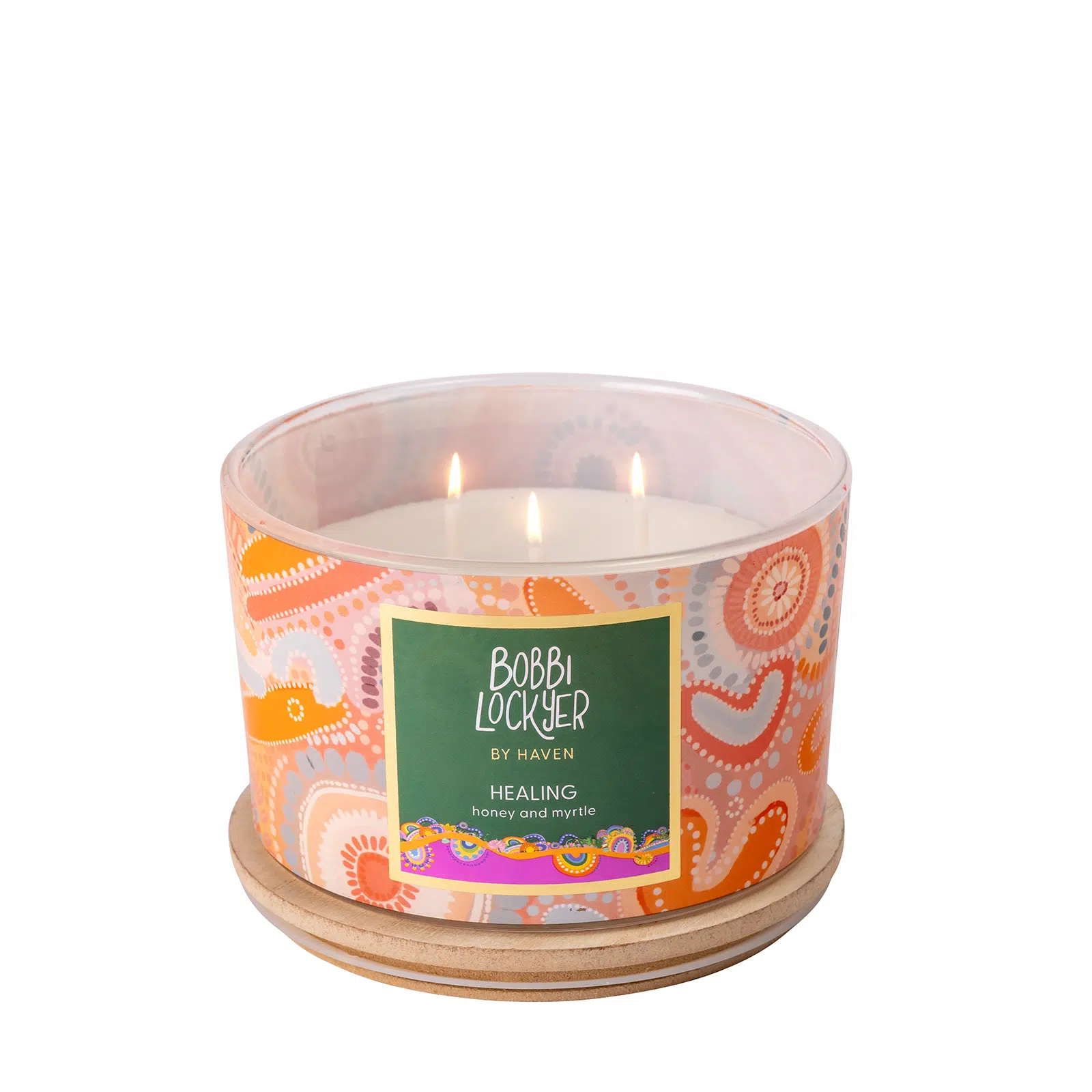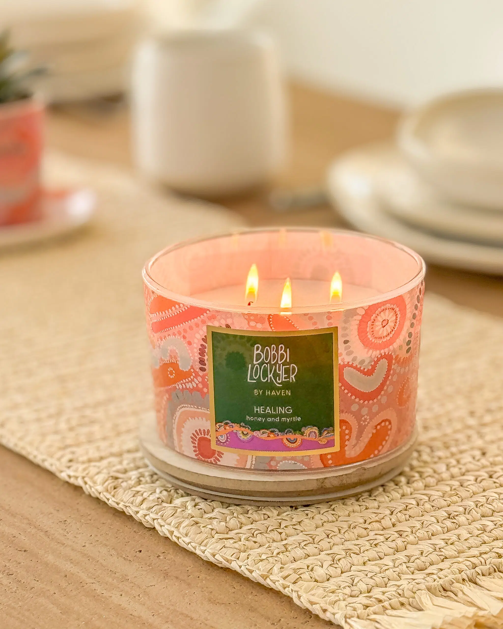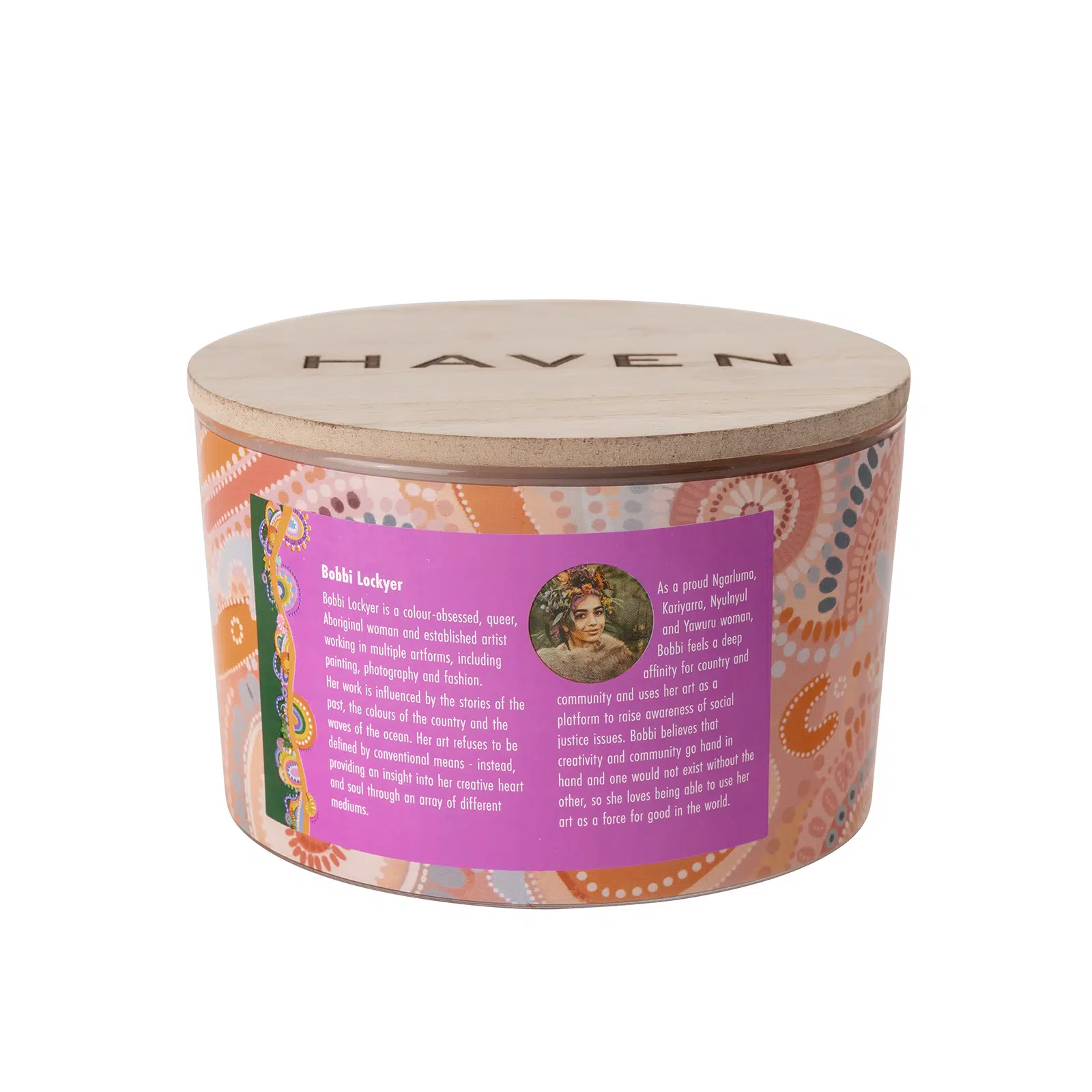 Embark on a sensory journey through the heart of Australia with Haven Candles, which proudly presents a unique collection in collaboration with esteemed Indigenous Australian artist, Bobbi Lockyer. Bobbi’s work is influenced by the stories of the past, the colours of the country and the waves of the ocean. This collaboration is a celebration of Australian culture, nature, and artistry. Through the unique combination of the handpicked fragrance and Bobbi’s art, this candle offer more than just a scent, they serve as a reminder of the country’s vast beauty, making each candle a cherished experience that ignites memories and dreams of exploring the enchanting landscapes of Australia.