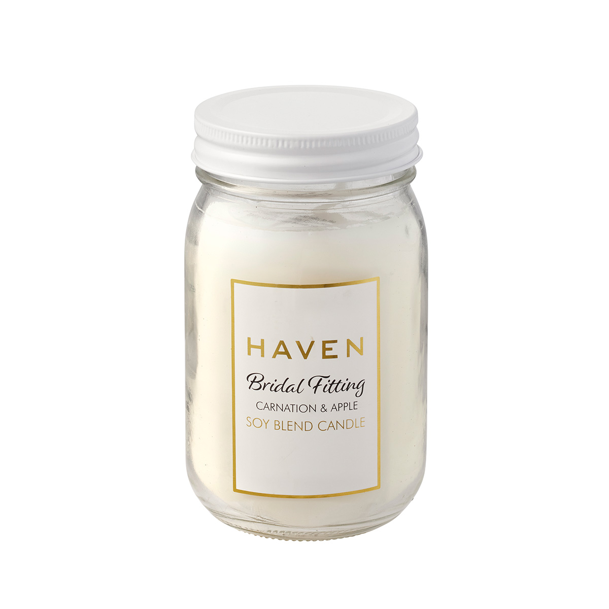 The Haven Bridal Fitting candle is an ode to love, Spring, and the wedding season. Featuring uplifting notes of carnation and apple, this candle will take you to the perfect wedding day and destination with its crisp and clean fusion of classic romantic scents. Presented in a classic mason jar style glass with a refreshing white lid.