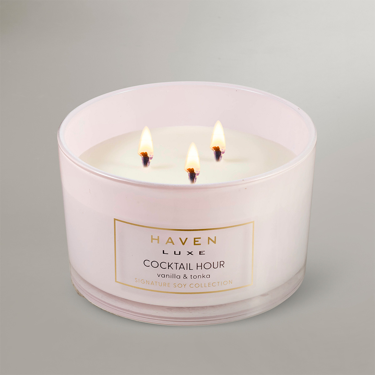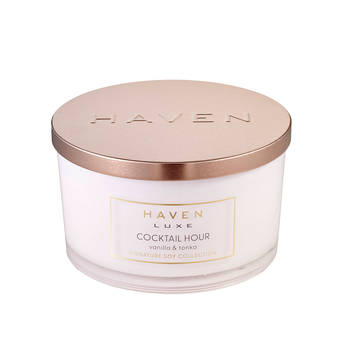 The Haven Luxe Cocktail Hour Scented Candle is inspired by sunsets, summer and sweetness. It wants to take you to the beach at dusk, and sip cocktails. This candle boasts a wide 3 wick design and a debossed metallic lid. Infused with notes of Vanilla and Tonka, this candle pairs perfectly with the Haven Luxe Cocktail Hour Reed Diffuser.