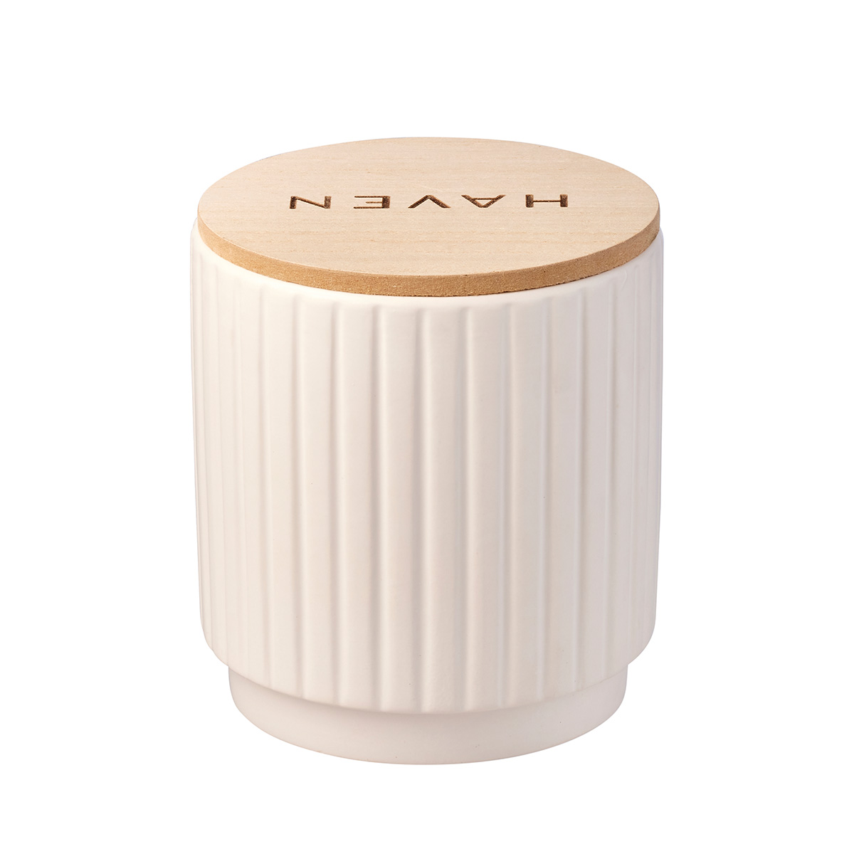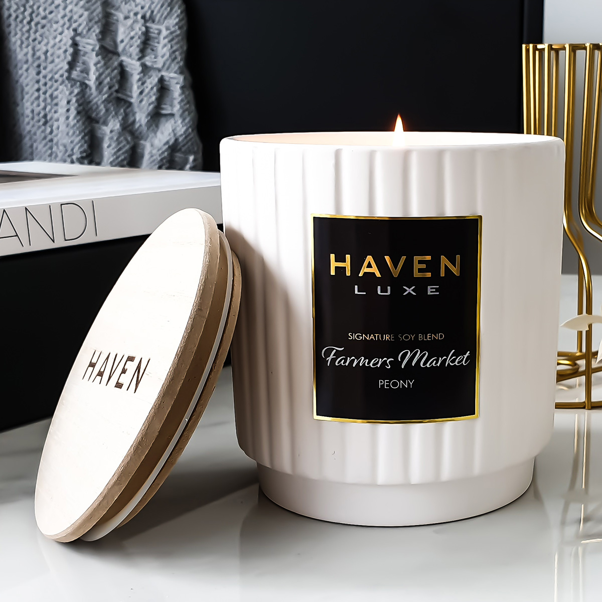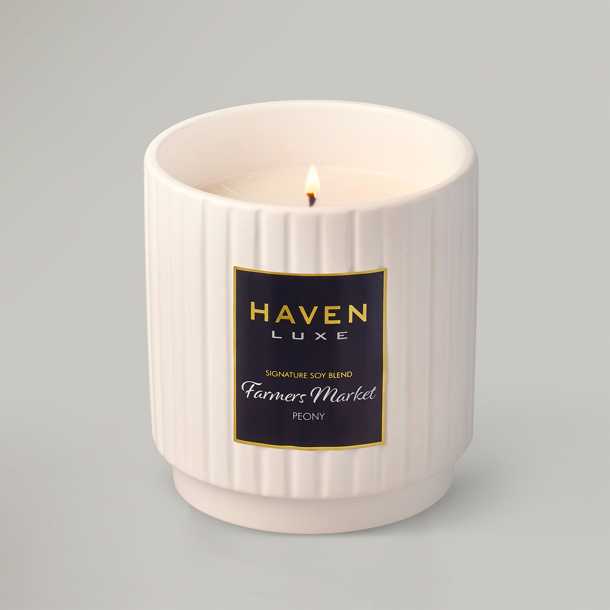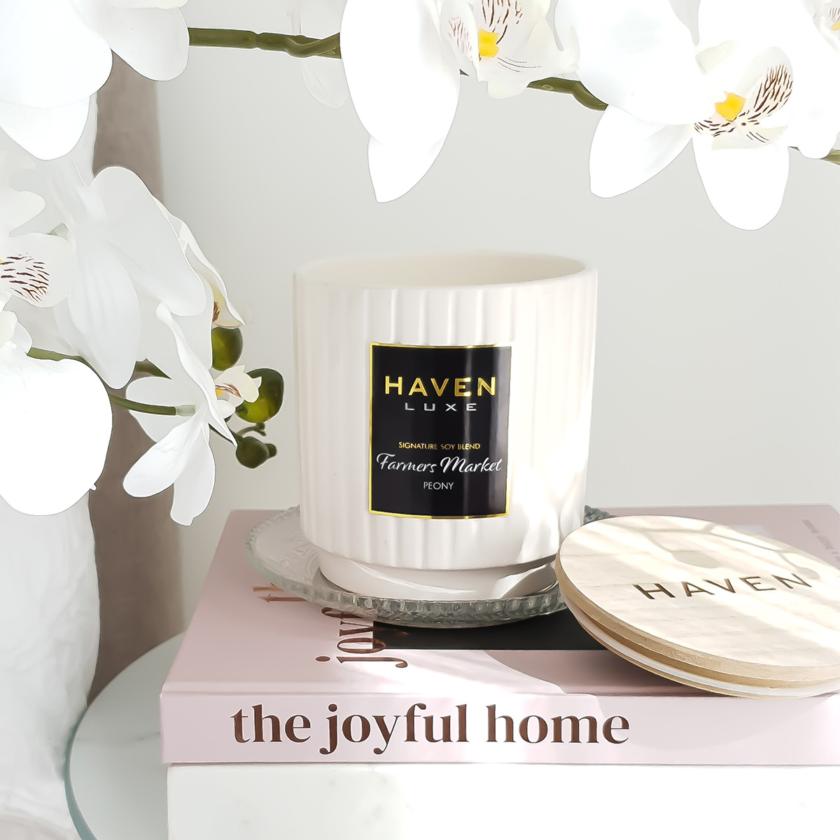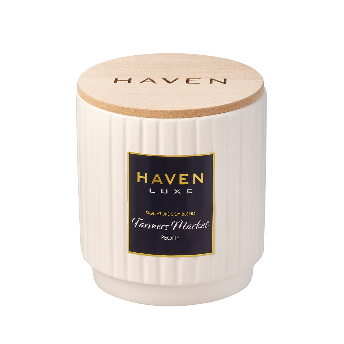 The Haven Luxe Farmers Market Scented Candle is inspired by crisp mornings and blooming flowers. Let it take you to a weekend produce market, with fresh flowers and hot coffee. This candle features a modern ribbed ceramic design, with an etched timber lid, and contains scent notes of Peony.